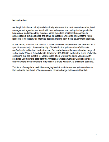 I worked with a team of peers to create this report highlighting potential future habitat for yellow cedar in response to climate change. The analysis compares historical climate variables to a 2080 Atmospheric/Oceanic General Circulation Model to identify suitable habitat for yellow cedar in an assumed A1B emissions scenario. I created a custom coordinate system for my area of study, as well as automated geoprocessing tasks with batch processes, iterators, and logical statements within model builder. This report was part of my GIS Certificate at Western Washington University.